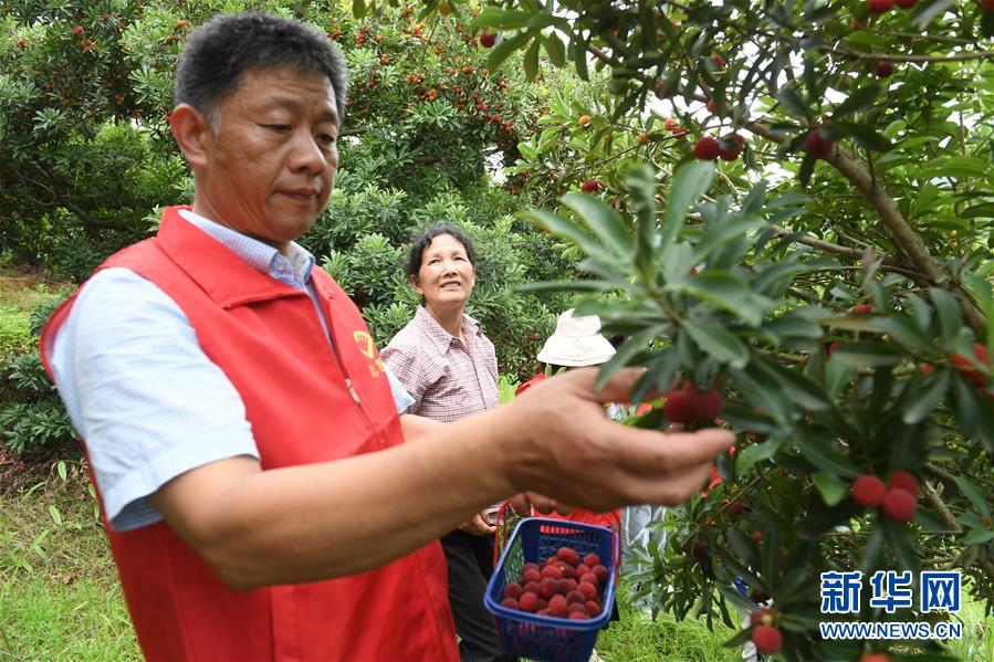 近日,浙江各地的杨梅陆续开采。位于杭州市富阳区新登镇的国家级生态村湘溪村,党员志愿者趁梅雨间隙帮助农户抢采杨梅。新华社记者翁忻旸摄