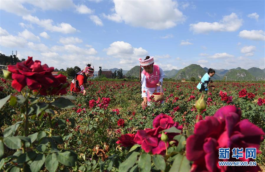 6月2日,云南丘北县八道哨乡阿诺村的少数民族妇女在种植基地采摘食用玫瑰花。云南省文山壮族苗族自治州丘北诺香花卉农业科技开发有限公司自2016年以来发展食用玫瑰花种植1200亩,集生产加工、销售玫瑰花系列产品及旅游观光于一体,带动当地300多户群众脱贫增收。新华社记者杨宗友摄