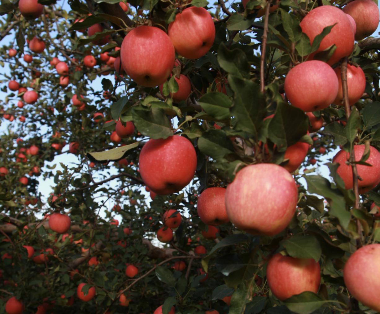里炮村距离市区77公里,驱车1小时即可抵达。村子曾被评为北京市级果树专业村,村里的苹果种植面积达1200亩,今年的苹果总产量预计约160~180万斤,主要以“红富士”“国光”为主。村子的道路两旁,可以看到大片的苹果树和遍布的采摘园。更让人眼前一亮的是,不同品种的苹果沉甸甸地挂满枝头,鲜红与粉嫩的果实在绿叶映衬下相映成趣,令人目不暇接。