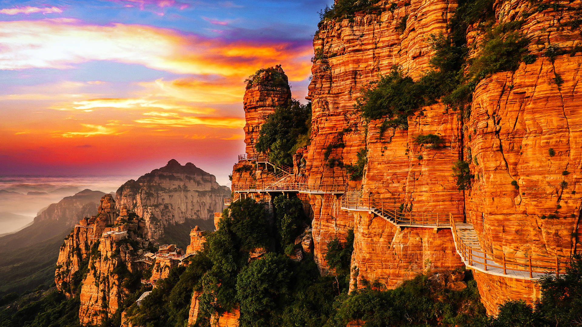 京娘湖:素有“太行三峡”之称的京娘湖,深秋时节正上演“层林尽染,万山红遍”的盛景。黄栌、漆树、枫树沿山势铺展,绿、黄、橙、红的色彩层层晕染,丹崖峭壁被秋风镀上暖意,游船驶过水面,惊起水鸟划破这幅流动的山水画卷。达人们乘船穿行于层峦叠嶂间,既赏秋日湖光与红叶相映的景致,又聆听“千里送京娘”的古老传说,深刻感受邯郸自然与人文交融的独特气质。