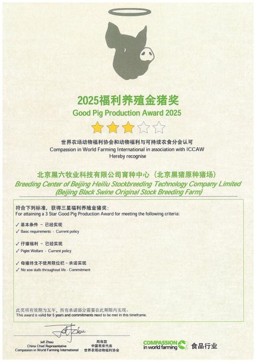 发布时间:2025-11-14 16:10:54 | 来源:中国网 | 作者:杨宇泽 | 责任编辑:王静近日,2025动物福利与可持续农食大会在北京平谷金海湖国际会展中心开幕,吸引了来自20余个国家和地区的700余位专家、学者和企业代表。会上,北京特色畜禽遗传资源北京黑猪保种单位——北京黑六牧业科技有限公司育种中心(北京黑猪原种猪场)被世界农场动物福利协会和动物福利与可持续农食分会认可,授予三星“福利养殖金猪奖”。该奖被公认为全球生猪养殖领域动物福利的最高标准之一,这是北京特色畜禽遗传资源在动物福利养殖领域又一次被国际认可。