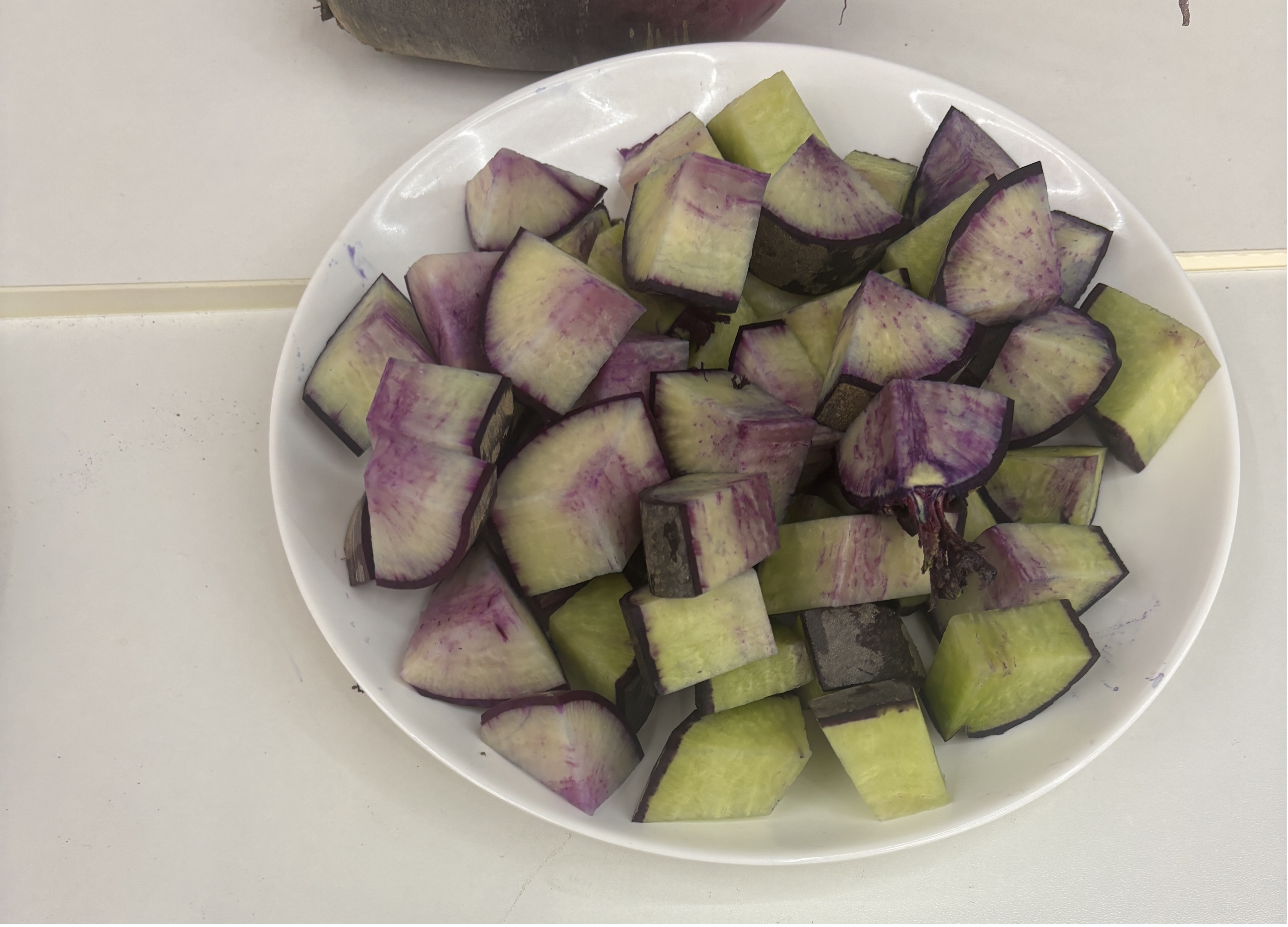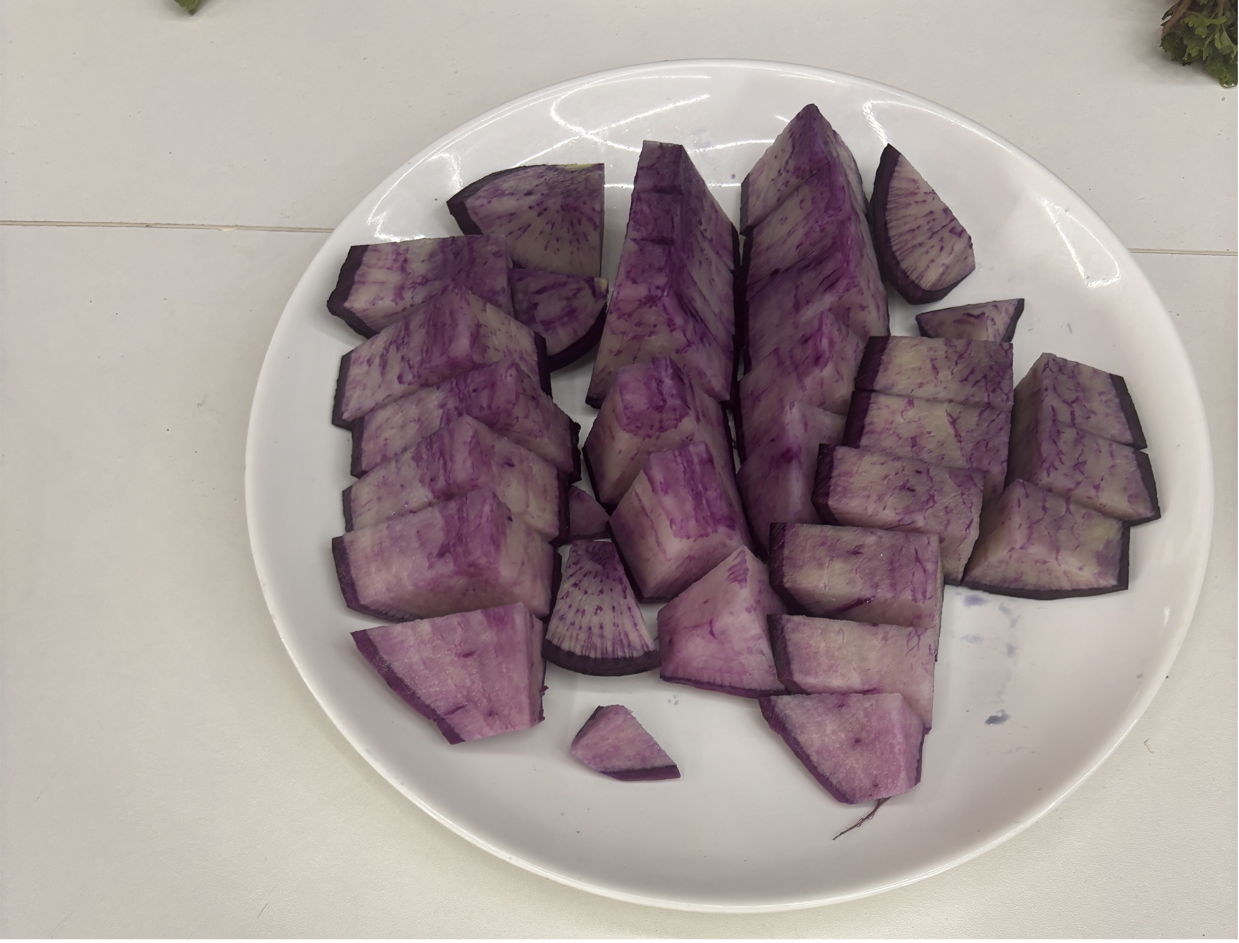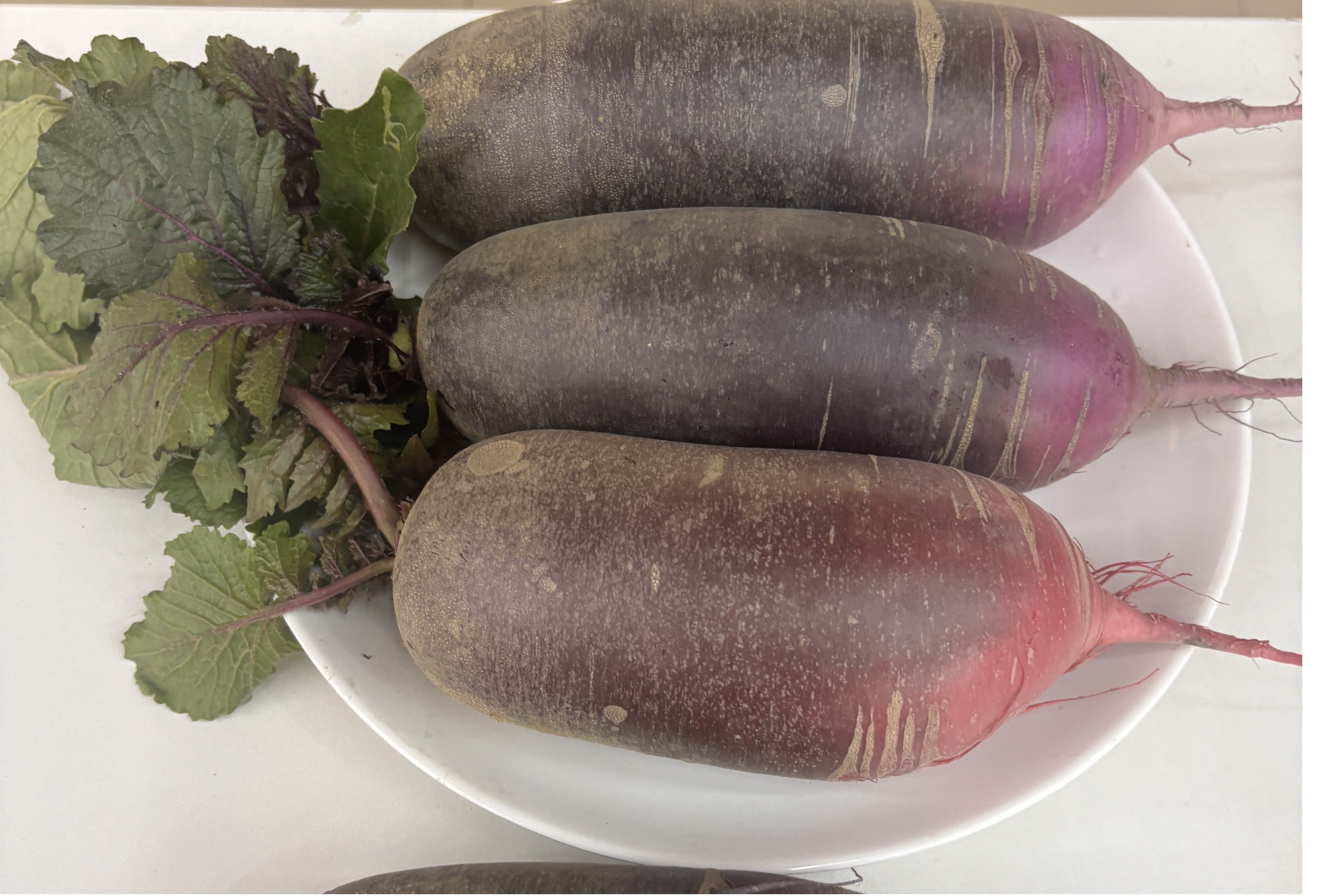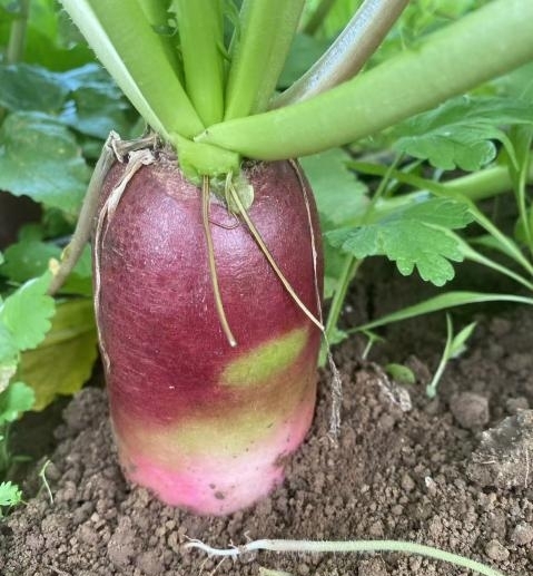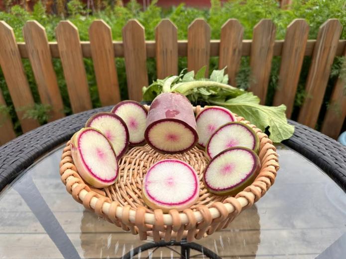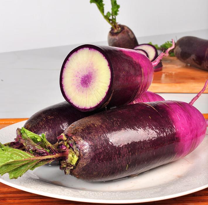 紫霞:表皮紫红,果肉紫绿渐变,脆甜无辣。单根重600~800克,根长25厘米,根茎6~8厘米,富含花青素。口感脆甜,适宜做水果食用和做沙拉,也可凉拌。