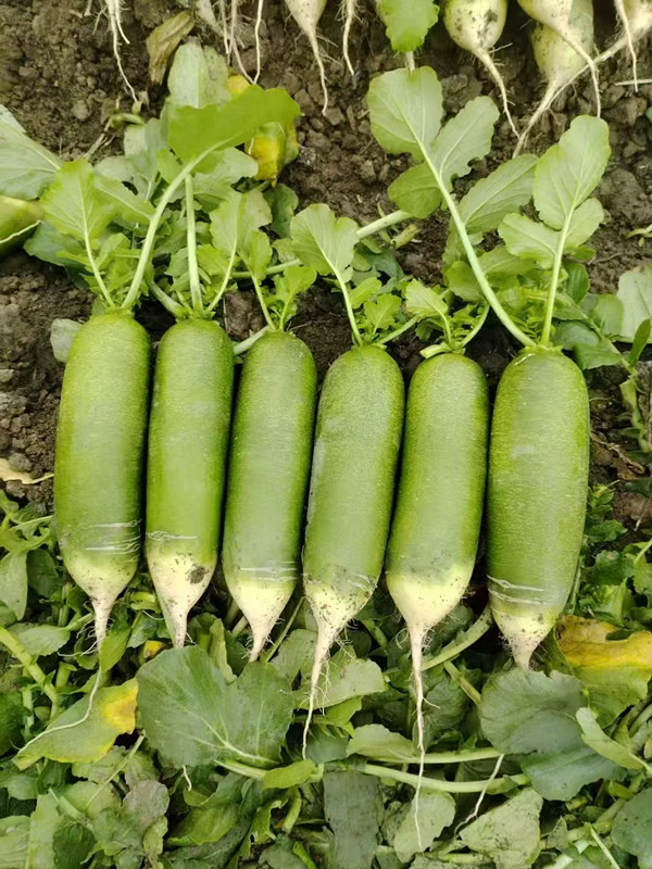 绿如玉:水果型萝卜,叶色深绿,羽状裂叶,肉质根长圆柱形,根长23~25厘米,直径6~7厘米。单根重800克左右,皮绿色,表皮光滑;肉色绿,生食品质脆甜,口感佳。生长期75~80天。