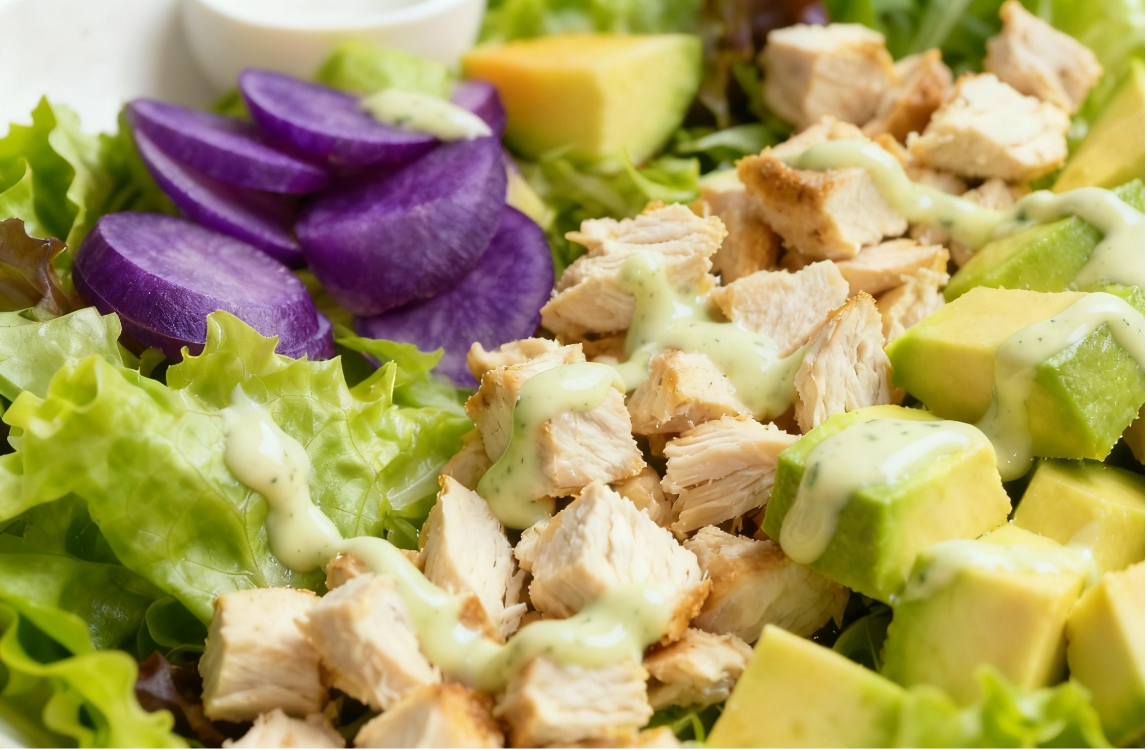创新沙拉:萝卜切片,搭配生菜、牛油果、鸡胸肉丁,淋低脂沙拉酱,兼顾营养与饱腹感。