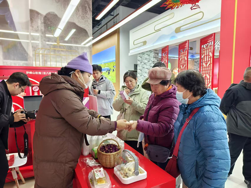 “妙峰山玫瑰”展台不仅提供了玫瑰酥饼供消费者品尝,还带来了以妙峰山玫瑰为原料研制的玫瑰精油、纯露、润肤霜等玫瑰系列护肤品。“我们的护肤品是由妙峰山玫瑰提取的精油生产的,质地滋润还有玫瑰的清香,非常适合秋冬使用!”妙峰山玫瑰采摘加工技艺第四代传承人李冉热情地向消费者介绍产品特点,产品销售火爆,尤其受到女性顾客的青睐。