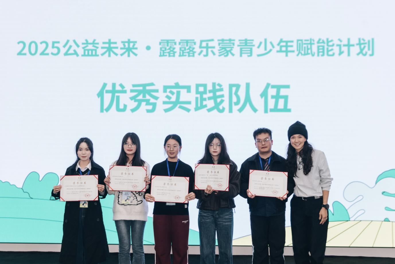 会上,对年度表现突出的大学生公益团队进行表彰。华南农业大学-铃兰工作室、四川大学-新长城自强社、广东南华工商职业学院-南粤童蒙大学生志愿服务队3支社团荣获“优秀社团”称号,他们凭借创新的服务模式和扎实的落地成效,成为青年公益实践的优秀案例。高校志愿者代表华南农业大学-铃兰工作室的黄国毅同学在分享中提到,校园内开展的各类赋能活动,比如趣味运动会,能够促成与同辈间的积极互动,运动会中有趣的农业属性项目,比如插秧、捉虫子、运粮车比赛等,实现了参与师生身心成长的双向赋能与相互治愈。四川大学-润心续爱队的刘思源同学作为大学生代表生动地讲述了自己参与乡村实践的成长故事,分享了乡村服务中的感人瞬间,更提及在扎根乡村开展服务的过程中,自己在心态韧性、情绪管理和团队协作等方面的显著提升,再现了志愿者“身入乡村、更心入乡村”的责任担当。本次表彰为获奖队伍颁发了荣誉证书,提供了激励经费,助力其后续公益项目的持续开展。
