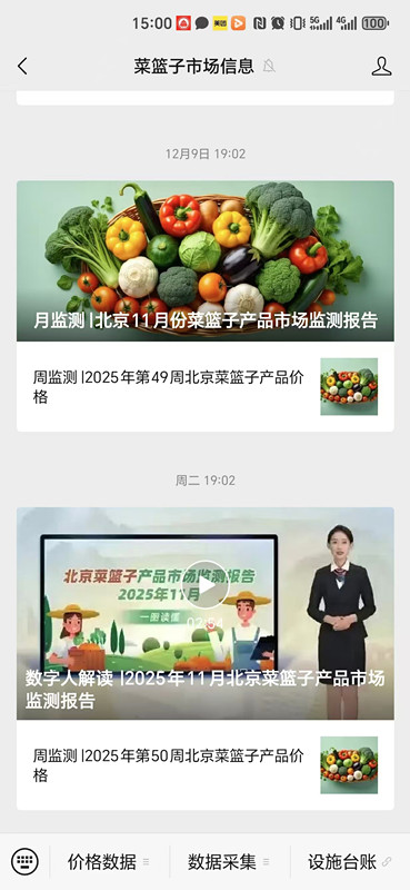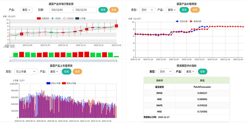 自2025年以来,北京市数字农业农村促进中心以科技项目为重要抓手,聚焦蔬菜产业高质量发展,在提升预测预警服务能力方面取得了阶段性的成效。一是数据监测范围有序拓展。将北京鲜活农产品流通中心(黑庄户市场)纳入批发市场监测,年内新增的30家环京基地纳入蔬菜产地监测,增加新发地种业市场8家农资销售商户为农资价格监测点;全年监测蔬菜产销数据60多万条。二是预测预警技术不断突破。研究构建了反映京津冀蔬菜产销情况的系列指数;利用深度学习技术建立了蔬菜价格预测模型和异常波动识别模型,定期完成54种蔬菜未来14天、未来4周、未来3个月价格预测及风险预警;通过数据分析摸清了河北、山东、内蒙等主产区蔬菜茬口和上市时间分布;累计完成各类分析预测报告72篇。三是信息服务模式开拓创新。开通“数说市场”直播服务,主打“菜篮子”微信号服务,通过多种渠道引导农业生产经营主体准确把握市场、更好应对市场。“数说市场”直播已完成12期,累计38816人次收看,“菜篮子”微信号用户规模突破16000人。四是市场信息引导蔬菜结构调整打开局面。分析提出《基于市场信息引导蔬菜生产结构调整的建议》,明确了北京地产蔬菜7大主导产品及20个优势茬口;在12个区、19个乡镇、22个示范点进行试点示范,针对主导蔬菜产品的关键茬口制作了服务手册,包括蔬菜历史价格走势、高低价时段分布、10大主产区及上市时间分布、市场行情预测等内容,并通过京东、中国邮政、美团等渠道为示范点开展产销对接服务。各示范区主导蔬菜产品和优势茬口均有不同程度的稳定和强化。